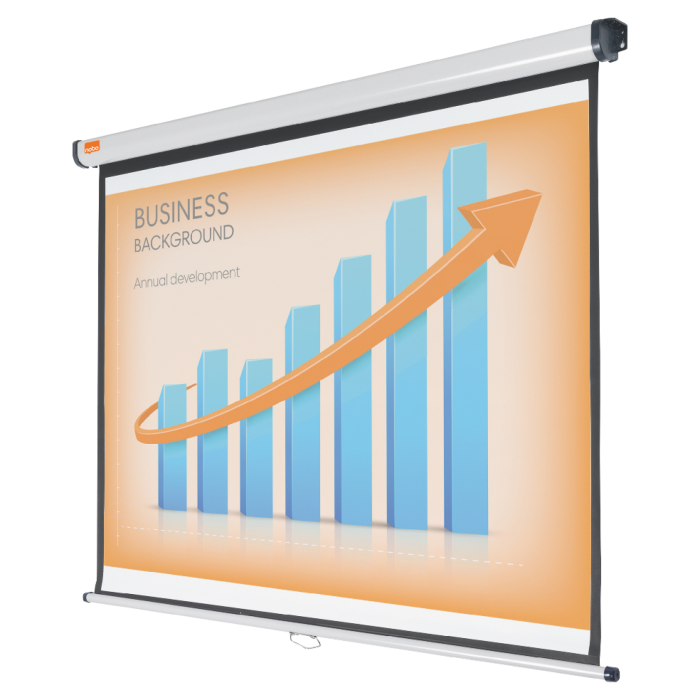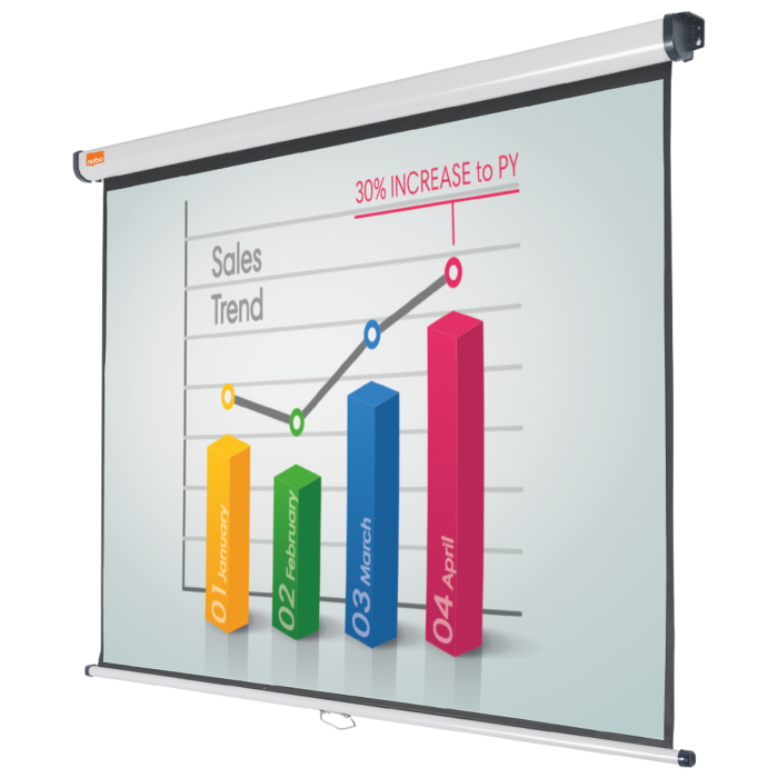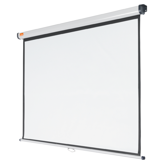 Žiarivý matne biely povrch plátna zaručuje ostrý, podrobný obraz, ktorý zreteľne uvidia všetci diváci. Dá sa ľahko zasunúť do puzdra, aby bolo chránené pred poškodením, alebo uložené, keď nie je používané. Doplnkové držiaky umožňujú inštalovať plátno pred popisovaciu tabuľu alebo ho skloniť smerom k divákom. 1500 × 1138 mm.