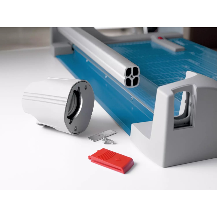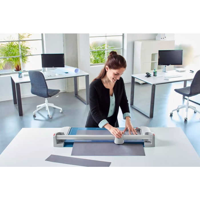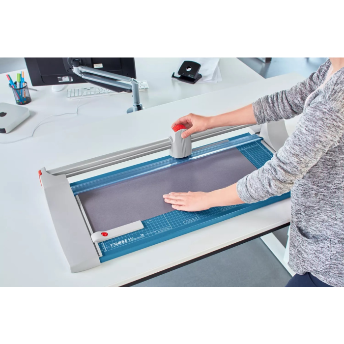 Užitočné formátovacie čiary na základni s milimetrovým delením pozdĺž reznej hrany uľahčujú zarovnanie rezaného materiálu. Kvalita na dosiahnutie najvyššej presnosti - automatický prítlak pohybom rezacej hlavy, nastaviteľný zadný doraz s použitím na oba boky, množstvo zakreslených orientačných DIN formátov. Kruhový nôž umiestnený v plastovom ochrannom kryte sa automaticky brúsi pri rezaní o protinôž (oba nože z tvrdenej ocele). Mierka v cm/inch. Možnosť montáže na stenu.