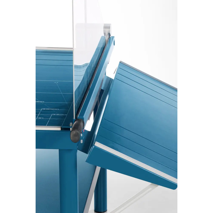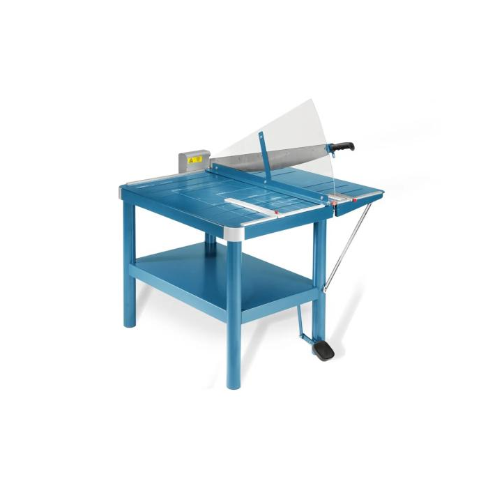 Veľká kovová robustná páková rezačka s vlastným stojanom a uzamykateľným nožom. Brúsený vrchný a spodný nôž z kvalitnej nožiarskej ocele Solingen, rozkladateľný bočný stôl, nožný pedál na zabezpečenie prítlaku rezaného papiera, priehľadný ochranný kryt ostria z plexiskla, 2 bočné dorazy, zadný doraz. Predný doraz, fixovateľný ručnou pákou, vysúvateľný do 275 mm. Mierka v cm/ inch, DIN formáty.K rezačke je možné objednať zariadenie na rezanie tenkých prúžkov a zariadenie umožňujúce vytvoriť laserový lúč, indikujúci reznú líniu.