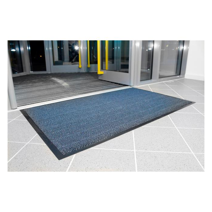 Ekonomická a účinná stieracia rohož vhodná do vstupných priestorov, hál a chodieb. Rubová strana z PVC s úpravou proti pošmyknutiu a znečisteniu, materiál vlasu je 100 % polypropylén. Výška 7 mm. Rozmery 90 x 150 cm. Farba čierna/modrá.