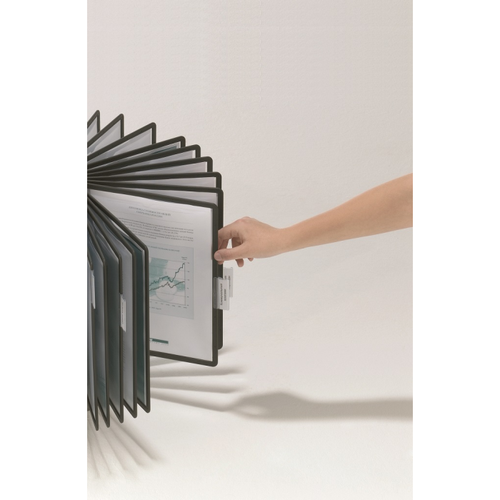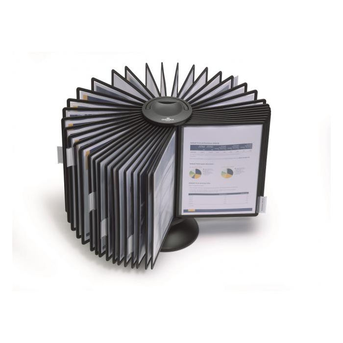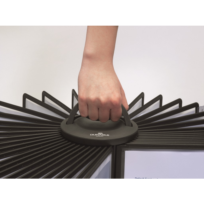 Rotačný stojan obsahuje 40 čiernych panelov A4 a 40 indexov. Ľahko prenosný vďaka madlu na vrchu stojana.