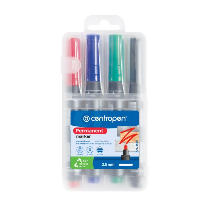 Sada 4 ks permanentných popisovačov. Atrament na alkoholovej báze odolný voči vode a teplote do 100 °C. Hrot okrúhly, šírka stopy 2,5 mm.