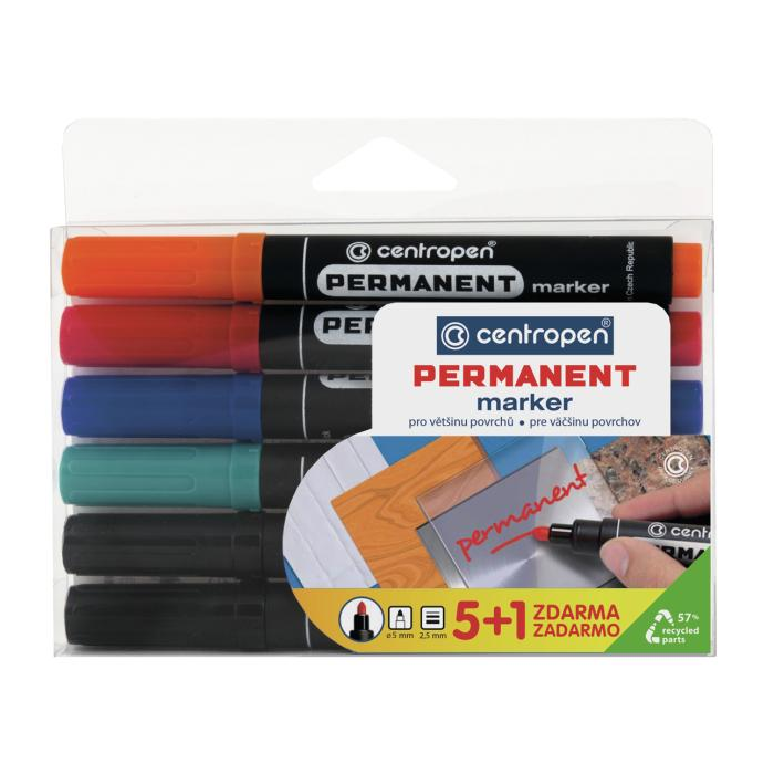 Permanentný popisovač na väčšinu povrchov. Odolá vode, oteru a poveternostným vplyvom. Alkoholová báza. 97 % recyklovaného materiálu.