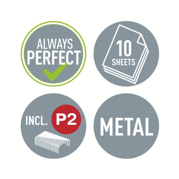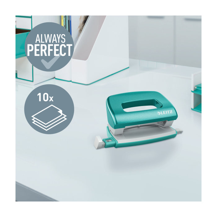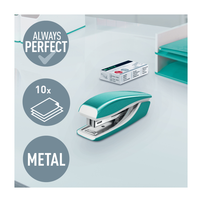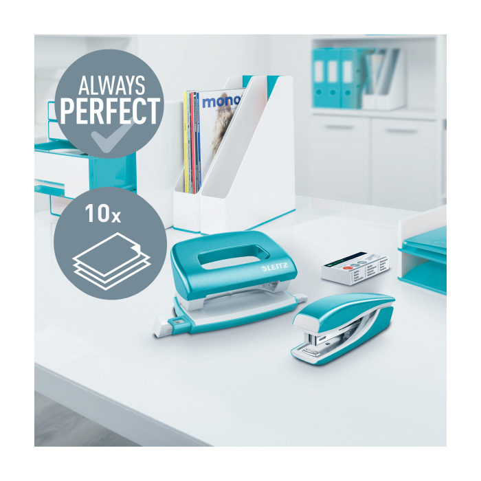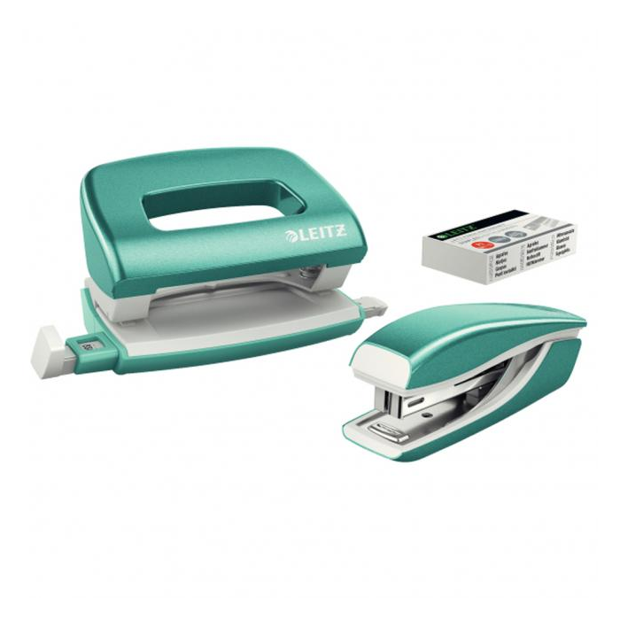 Minisúprava v moderných farbách. Malé a kompaktné rozmery. Kapacita 10 hárkov. Celokovová minizošívačka a dierovačka na použitie v kancelárii aj na cestách. Zošívačka s otvorením ramena o 180° na nástenkové zošívanie. Použite spinky Leitz Power Performance P2, č. 10, jedna škatuľka spiniek je súčasťou balenia. Dierovačka má príložník s kontrastnou potlačou jednotlivých formátov, rámček na jasné určenie formátu. Balenie v blistri. Farba modrá.
