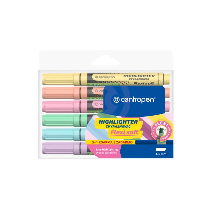 Veľkokapacitný zvýrazňovač so super pružným hrotom na hladké a pohodlné zvýraznenie textu na všetkých druhoch papiera. 6 atraktívnych pastelových odtieňov. 95 % recyklovaného materiálu.