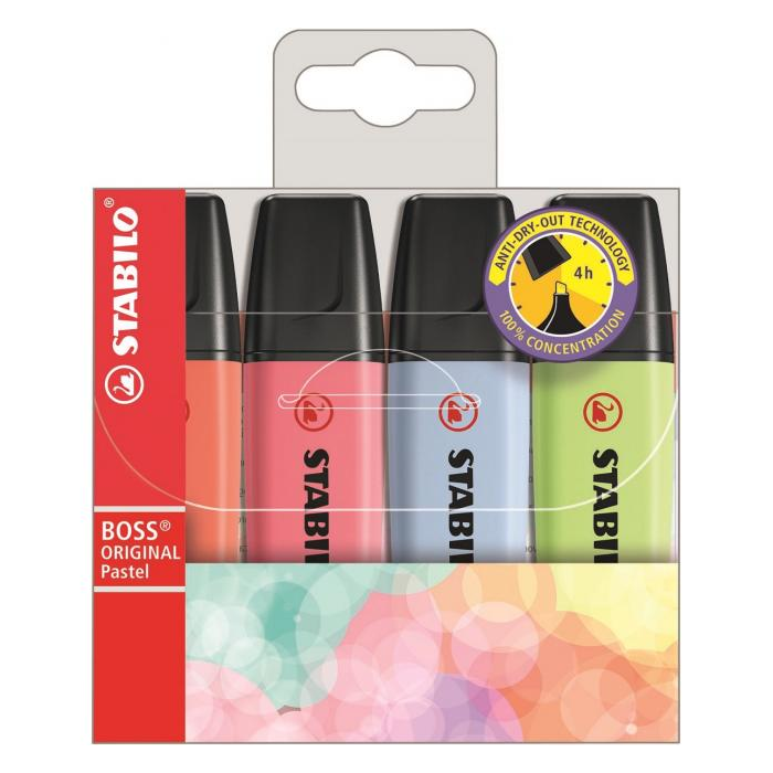 Jedinečný zvýrazňovač v 6 nových pastelových odtieňoch. V 2 šírkach stopy. Vhodný pre prácu s papierom, kópiami a faxom. Vydrží až 4 hodiny bez vrchnáčika a nevyschne. Značková kvalita od vynálezcu zvýrazňovača - BOSS Original je na trhu už od roku 1971. Nezameniteľný tvar zvýrazňovača, ktorý je možné použiť kdekoľvek. Univerzálny atrament na vodnej báze, mäkký hrot. Sada 4 ks.