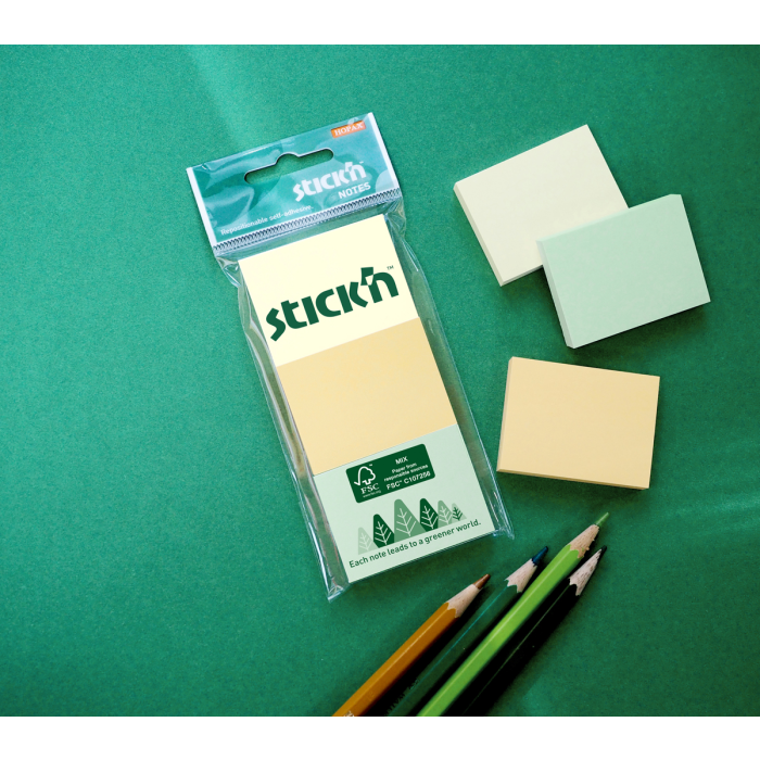 Samolepiace bločky v mixe pastelových farieb vyrobený z papieru, ktorý pochádza z ekologicky obhospodarovaných lesov. Certifikovaný papier šetrný k prírode využívá lepidlo na vodnej báze. Lístky idú ľahko nalepiť a odlepiť, napriek tomu skvelo držia. Nezanechávajú stopy po lepidle. Rozmery: 38 x 51mm, 3x100 lístkov, mix pastel. farieb, 3 bločky v balení.