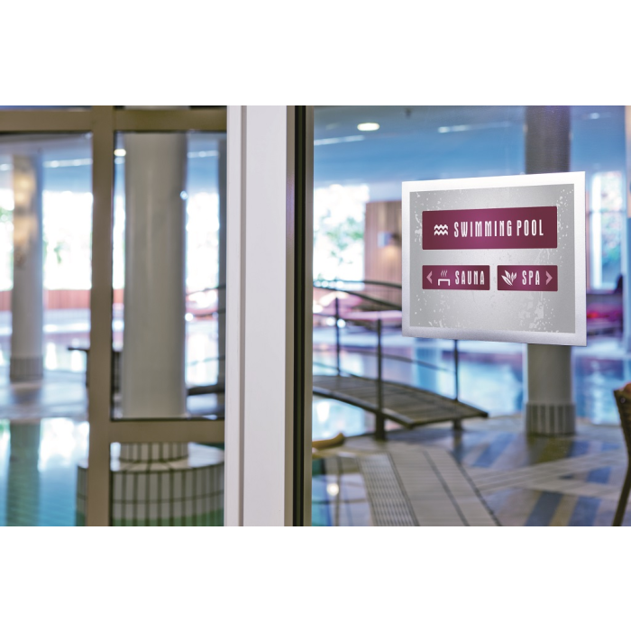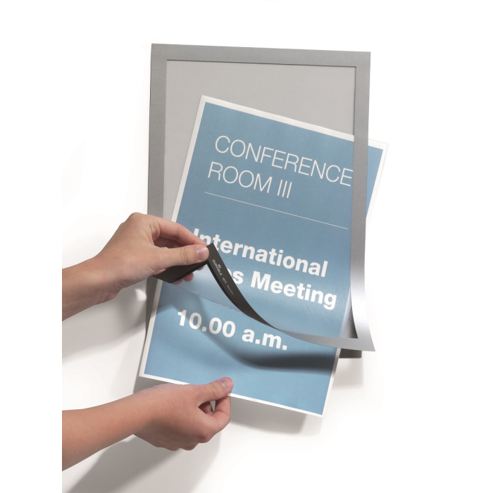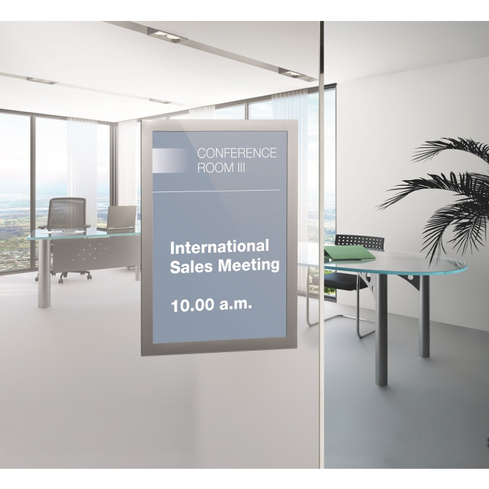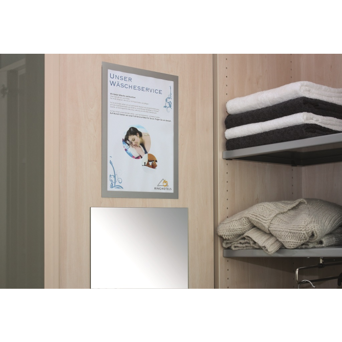 Samolepiaci informačný panel s prednou magnetickou časťou. Ideálny na vystavovanie plagátov, kľúčových informácií, špeciálnych oznamov alebo dôležitých čísel. Informácie sa ľahko vymieňajú a sú čitateľné z oboch strán, ak sa panel umiestni napr. na okno alebo priehľadné dvere. Vhodný na hladké a pevné povrchy. V prípade potreby je ľahko premiestniteľný bez potreby vŕtania. Formát A4, rámik strieborný.