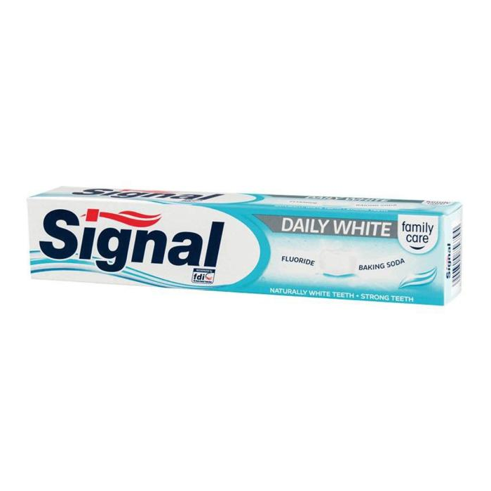 Zubná pasta Signal Daily white čistí a chráni zuby. Vďaka obsahu bikarbonátu sodného obnovuje prirodzenú belosť vašich zubov. Obsahuje fluorid, ktorý posilňuje zubnú sklovinu a ochraňuje ich pred vznikom zubného kazu. Čistite si zuby 2x denne po dobu 3 minút. Deti do 6 rokov len pod dohľadom dospelej osoby, hrozí prehltnutie. Objem balenia 75ml.