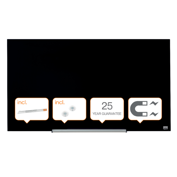 Na širokouhlé sklenené tabule Nobo sa vojdú všetky vaše nápady! Širokouhlý formát a minimalistický rámček maximalizujú využiteľnú plochu na písanie. Systém InvisaMount™, pre jednoduchú inštaláciu na stenu, schová všetky montážne prvky za doskou tabule. Vďaka tomu tabule majú moderný, štýlový a ničím nerušený dizajn. Súčasťou tabule je taktiež odnímateľný hliníkový odkladač na popisovače. Magnetický sklenený povrch zaručuje najlepšiu možnú mazateľnosť a je vhodný na každodenné používanie. Veľkosť uhlopriečky: 45” (114 cm).