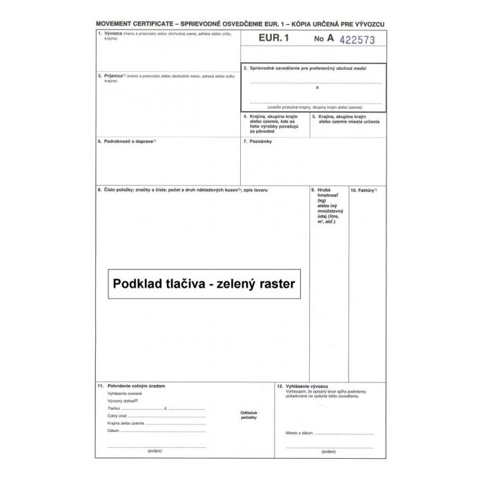 Tlačivo : Sprievodné osvedčenie EUR.1 samoprepis 3 listy.