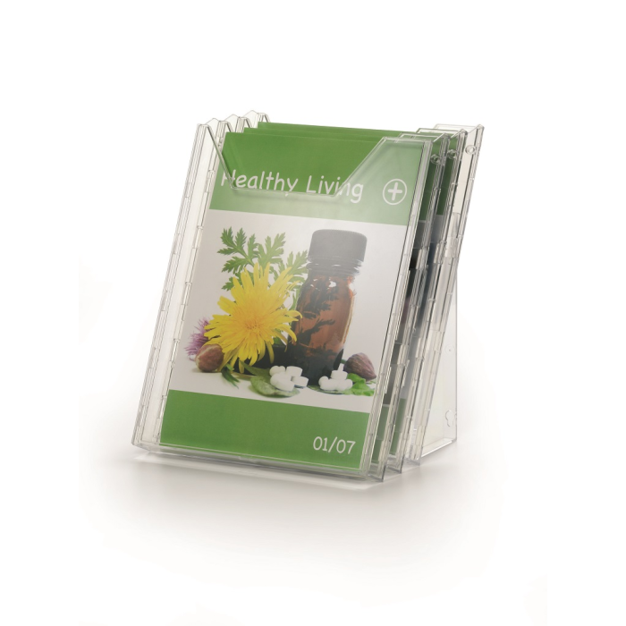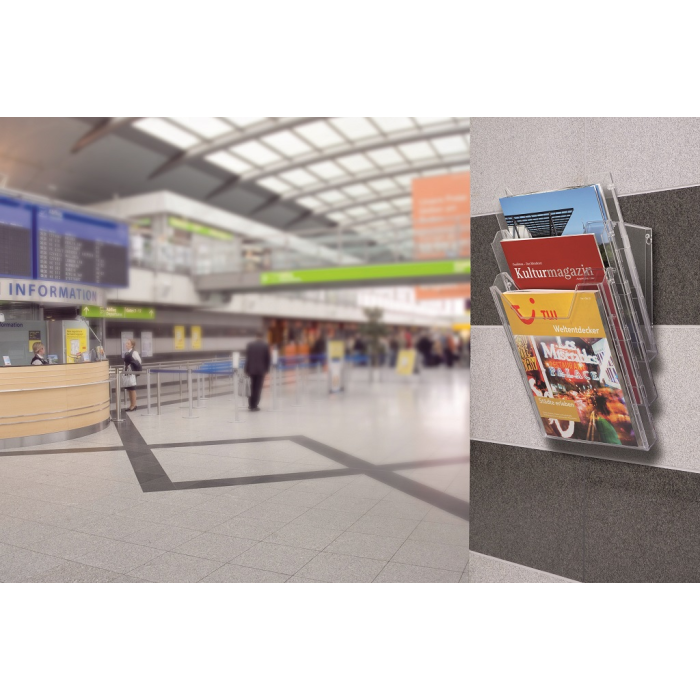 Kombinovaný stojan s tromi odkladačmi na prospekty a časopisy formátu A4 s tromi odkladačmi a závesným dielom na stenu, resp. stôl. Materiál priehľadný plast. Hrúbka 24 mm. Vnútorné rozmery 240 × 311 mm.
