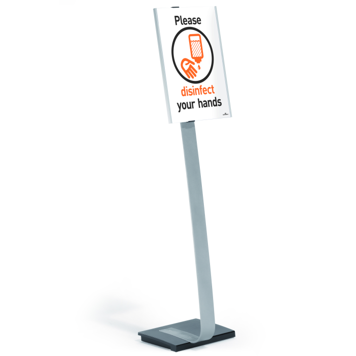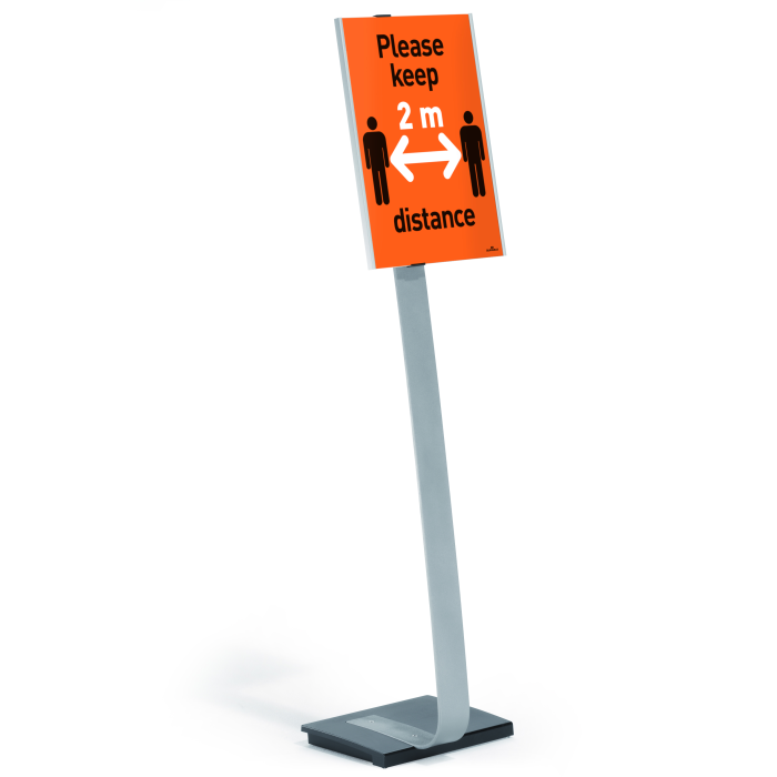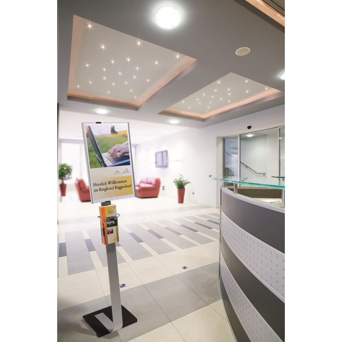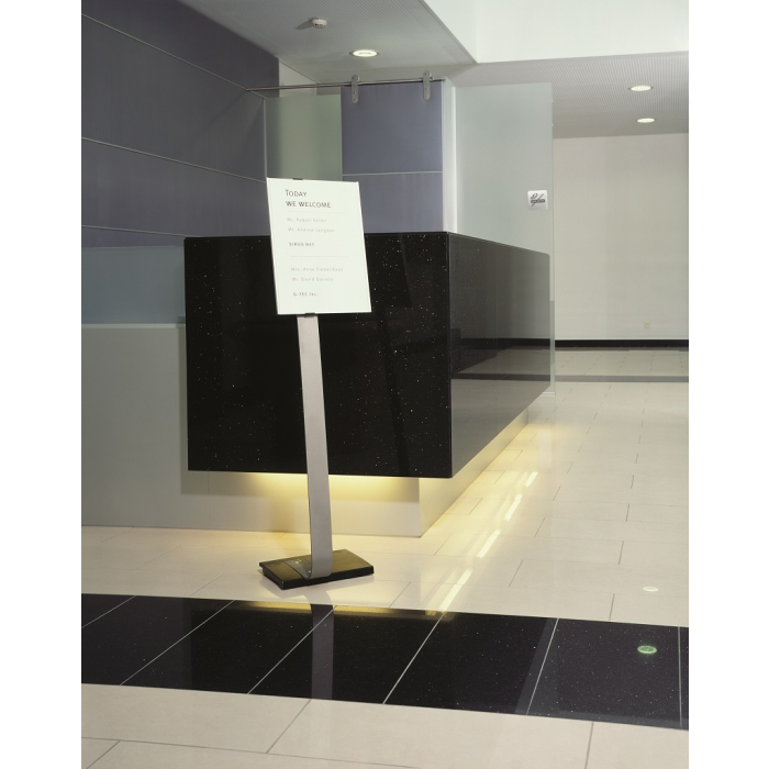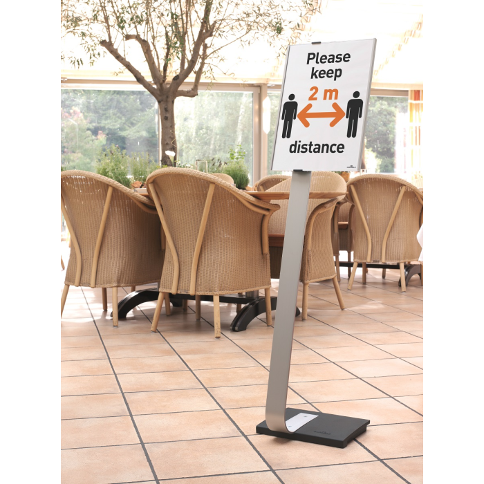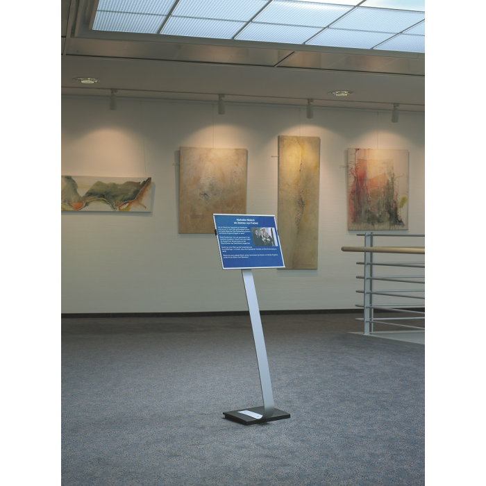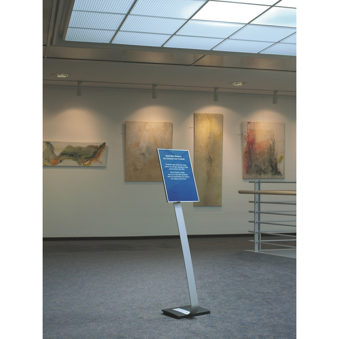 Vysoko kvalitný elegantný hliníkový stojan s informačným panelom formátu A3, použiteľným na výšku alebo na šírku. Zaťaženie stojana a gumové podložky zabezpečujú stabilitu. Protiodrazový panel je možné otočiť vertikálne alebo horizontálne a naklápať v rozmedzí 10 stupňov.Šablóny na potlač sú voľné stiahnuteľné na www.durable.de.