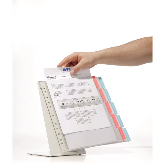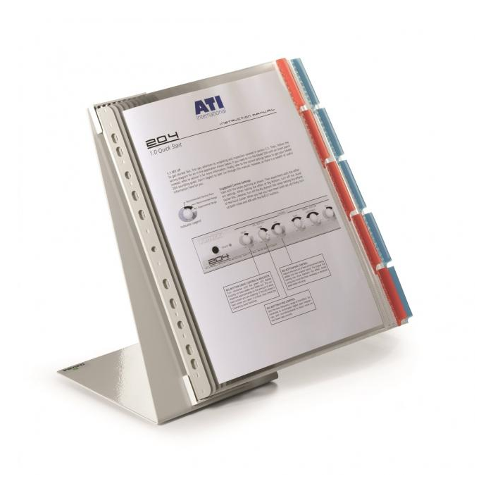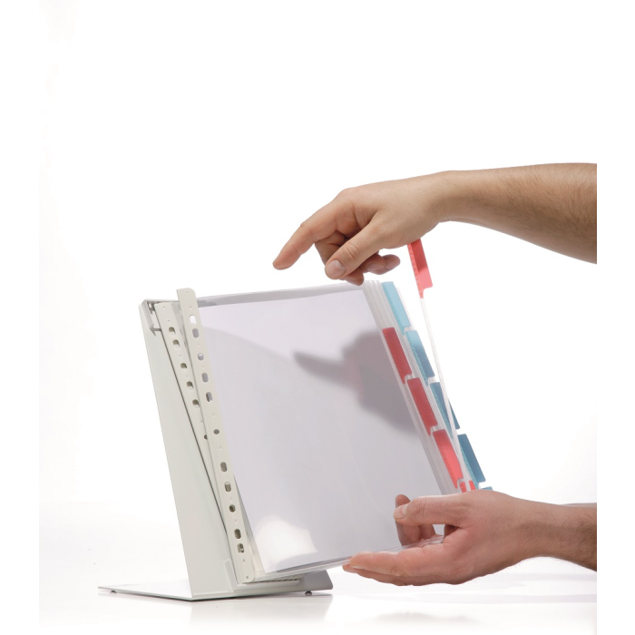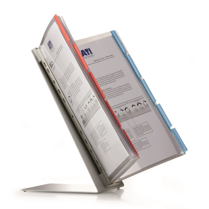Extrémne pevný stojan na stôl v tvare L. Vyrobený z kovovej platne s plastovým poťahom odolným voči oderu. Dodávaný s 10 displejovými PVC panelmi. Farby panelov: 5 ks červenej a 5 ks modrej.