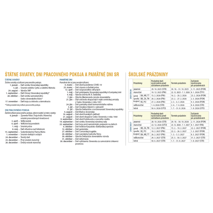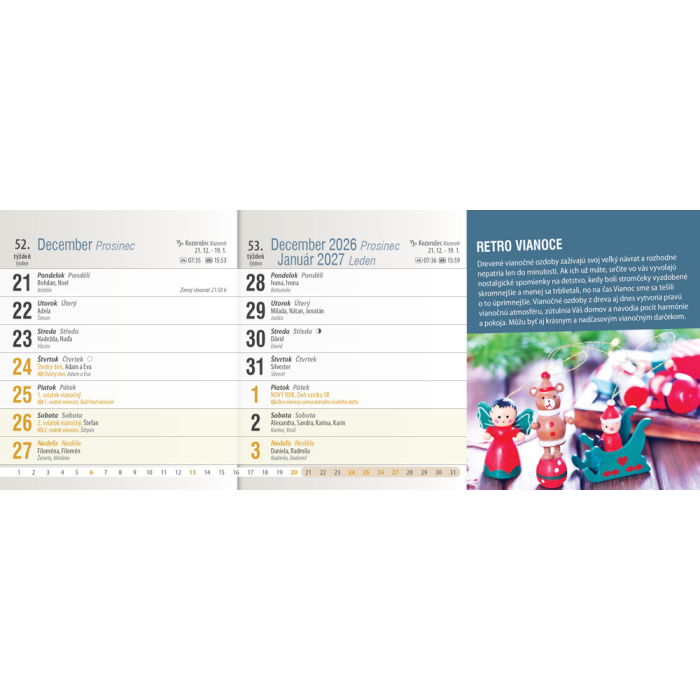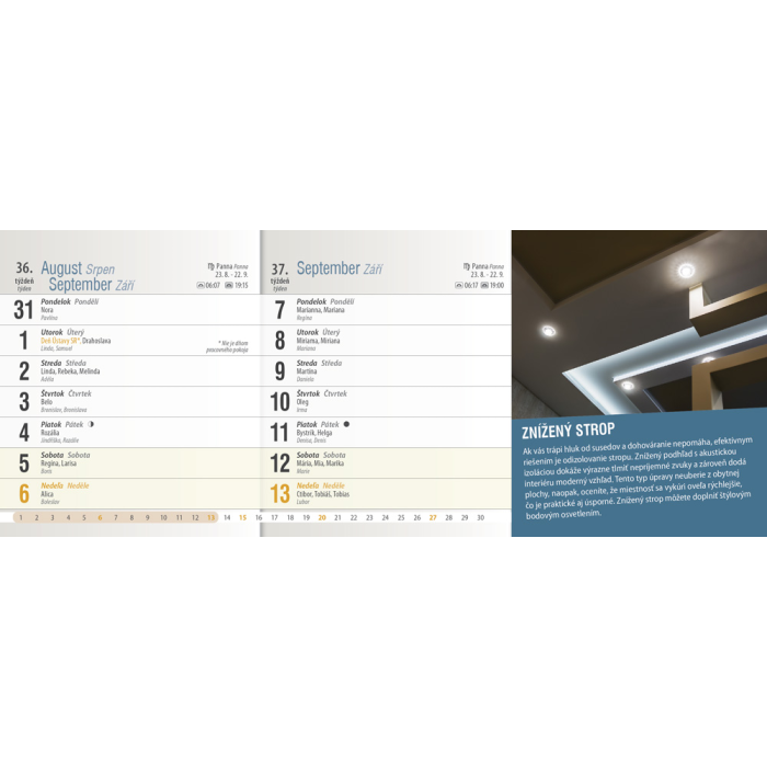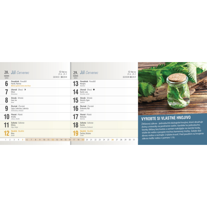 Dvojtýždňový kalendár prináša zaujímavé tipy, triky, nápady a inšpirácie, ktoré využije každý, či už býva v byte, dome, či trávi čas na záhradke. Obsahuje riadkové kalendárium so slovenskými a českými menami, štátnymi sviatkami oboch krajín, východmi a západmi Slnka, fázami Mesiaca a školskými prázdninami.