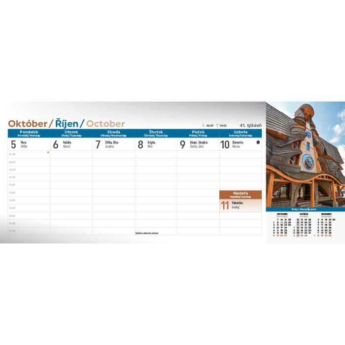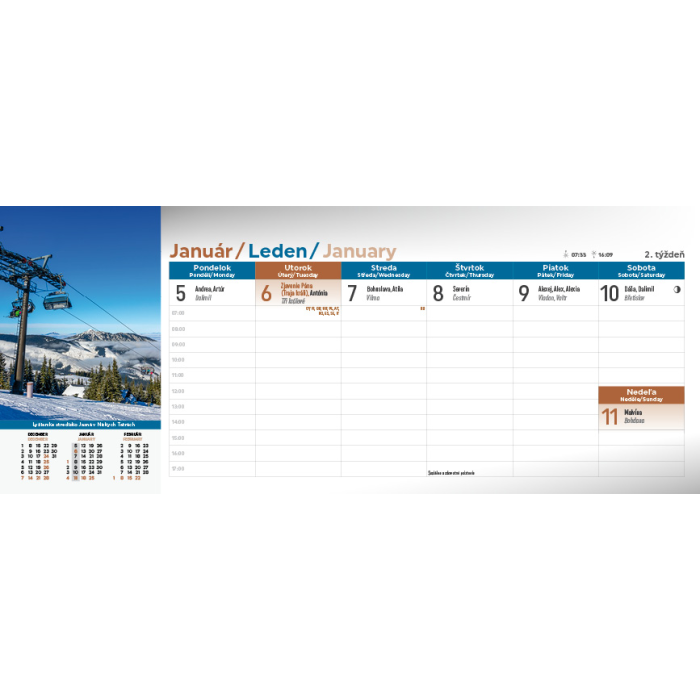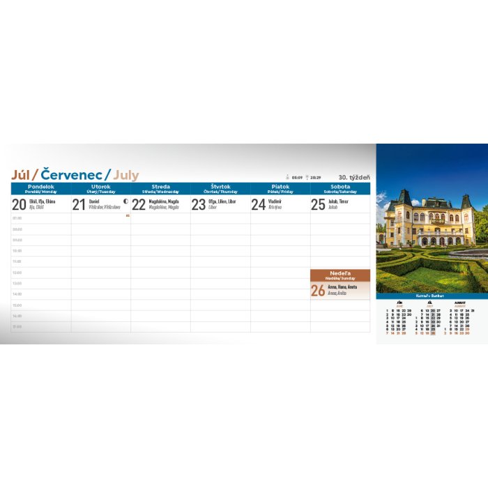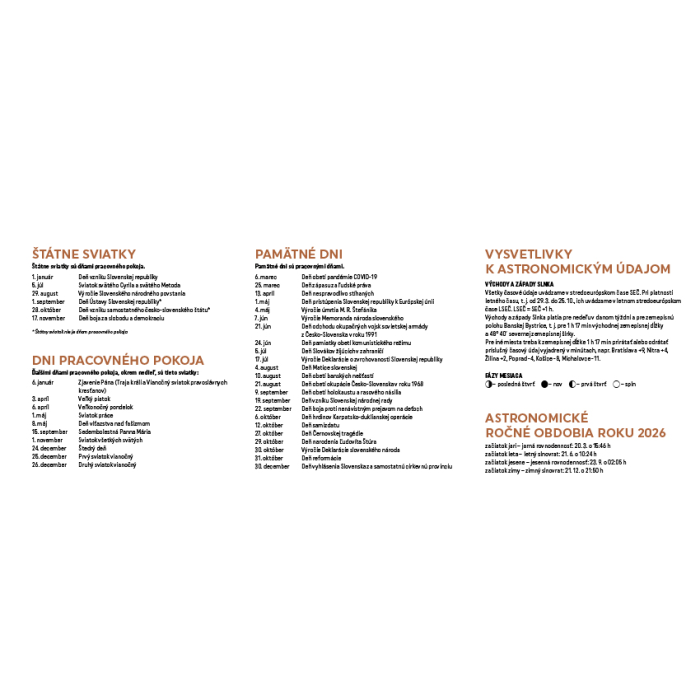 Spoznajte krásy Slovenska prostredníctvom stolového kalendára Slovensko. Týždňový stĺpcový kalendár s hodinovým delením, daňovými pripomienkami, fázami Mesiaca, východmi a západmi Slnka, štátnymi sviatkami všetkých krajín EÚ, školskými prázdninami, slovenskými a českými menami (plus netradičné mená).