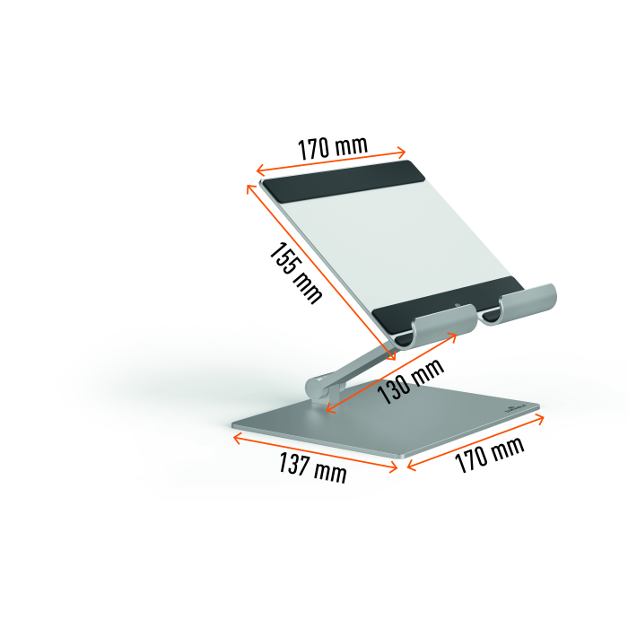 Univerzálny, stojan pre smartfóny a tablety od 13” do 15”. Priestorovo úsporný, skladací a ľahko prenosný. Maximálna nosnosť: 1 kg. Sklopný pre úsporu miesta. Vyrobený z vysoko kvalitného hliníka.