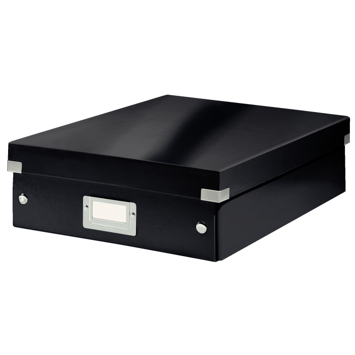 Štýlová skladacia krabica s vekom a s rámčekom na štítok. Na usporiadanie nabíjačiek, káblov a ďalšieho vybavenia kancelárie. Veľkosť M. Na prvý pohľad vidíte, čo sa vojde dovnútra! Výška krabice bola navrhnutá tak, aby vám poskytla dostatok priestoru na uloženie príslušenstva a zároveň zabránila skladaniu vecí na seba. Na vylepšenie usporiadania obsahu krabice použite priložený vnútorný systém priehradiek. Môžete rozdeliť krabicu na 2 alebo 3 časti a zabrániť tak miešaniu káblov alebo fotiek. Pevný kartón potiahnutý polaminovaným papierom. Farba čierna.
