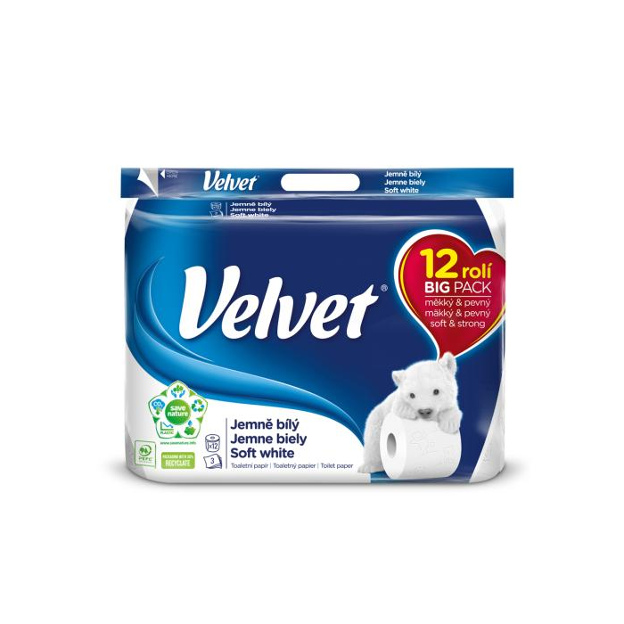Toaletný papier Velvet Jemne biely, ktorý má tri vrstvy mäkkého hodvábneho papiera s decentnou razbou s postavičkami medvedíkov. Každý útržok je optimálnou kombináciou pevnosti a zaručuje zamatovú mäkkosť papiera Velvet. 3vrstvy, 12 roliek po 150 útržkoch, 100% celulóza`
