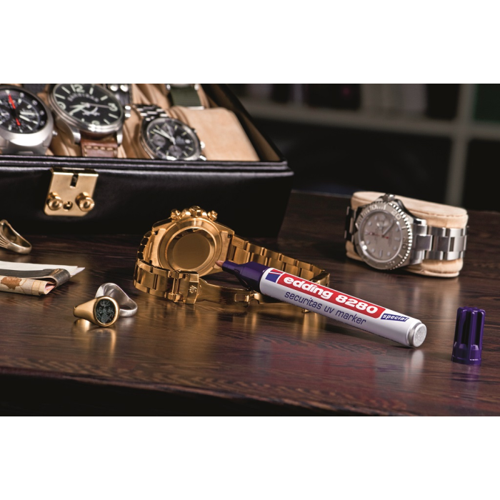 Popisovač so špeciálnym atramentom, viditeľným výhradne pod ultrafialovým svetlom. Okrúhly hrot, šírka stopy 1,5 - 3 mm. Väčšie balenie 10 ks.