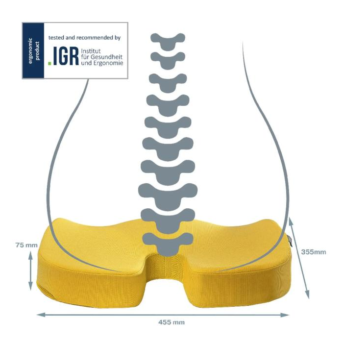 Vankúš je nvrhnutý tak, aby podporoval zdravé držanie tela, zlepšoval krvný obeh a zmierňoval tlak na chrbticu, čím pomáha výrazne znížiť nepohodlie, únavu a stuhnutosť. Tento štýlový ortopedický vankúš na sedenie s minimalistickým dizajnom a matnými farbami zlepší zdravie a pohodu tým, že bez námahy vytvorí dokonalé aktívne (pracovné) prostredie pre každého. Ručne prateľný látkový poťah. Farba žltá.