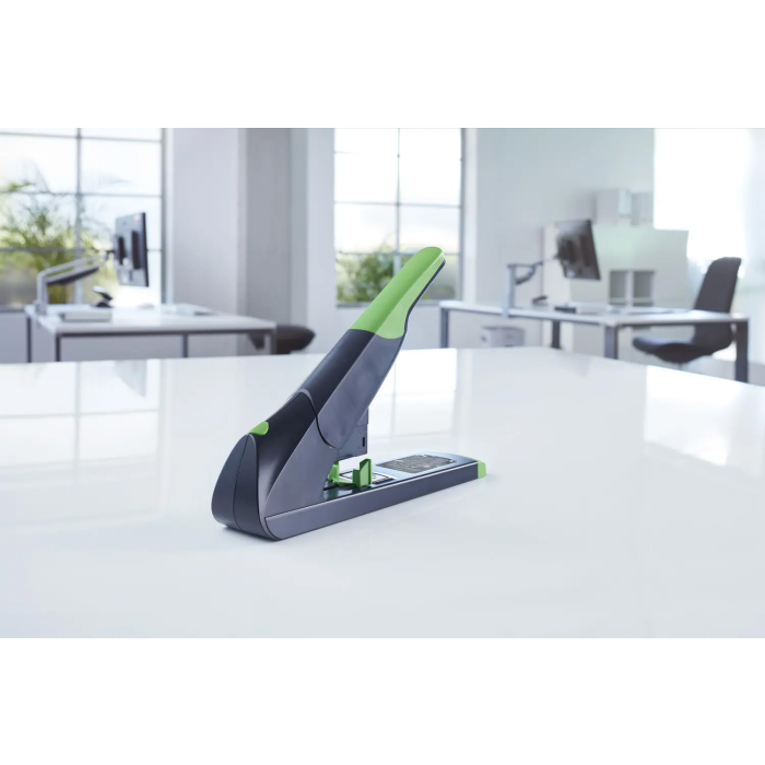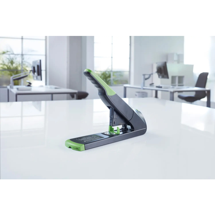 Veľkokapacitná zošívačka pre profesionálne použitie z kolekcie šetrnej k životnému prostrediu re+new. Kapacita súčasne zošitých listov až do 200 listov. Celokovová s plastovým krytom vyrobeným z udržateľného recyklátu. Systém ABS pre bezproblémové zošívanie bez zaseknutia spiniek. Kapacita náplne 100 spiniek 23/8 až 23/24 Super. Hĺbka zošívania 7,5 cm. Hmotnosť 1670 g. Záruka 25 rokov. Farba čierna.
