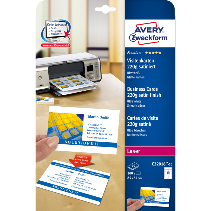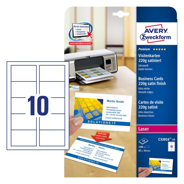 Vizitky s patentovanou technológiou QUICK & CLEAN™ pre ľahké vybratie z hárku. Kvalitný ultra biely papier na potlač 10 vizitiek saténovej úpravy veľkosti 85 × 54 mm z jedného hárku A4. Vhodné do laserových, farebných laserových tlačiarní a kopíriek. Farba ultra biela. Balenie 10 hárkov.