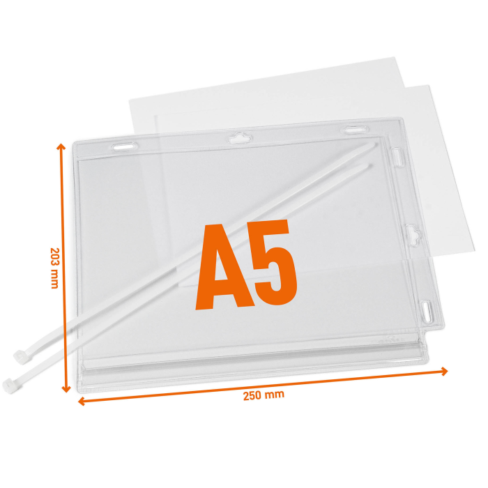• Vodeodolné vrecko formát A5 je ideálne na zobrazovanie informácií v exteriéri, ako sú záhradné centrá, sauny, bazény, brány a nástenky, kde upozornenia prichádzajú do kontaktu so striekajúcou vodou.