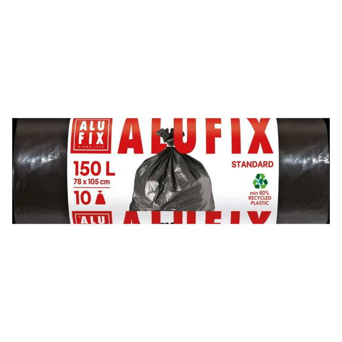 Vrecia na odpad silné, určené na stredne ťažký odpad, vyrobené z LDPE materiálu, čierne. Rozmery vreca 78 x 105 cm, objem 150 l, množstvo 10 ks na rolke, hrúbka 45 mikrónov.
