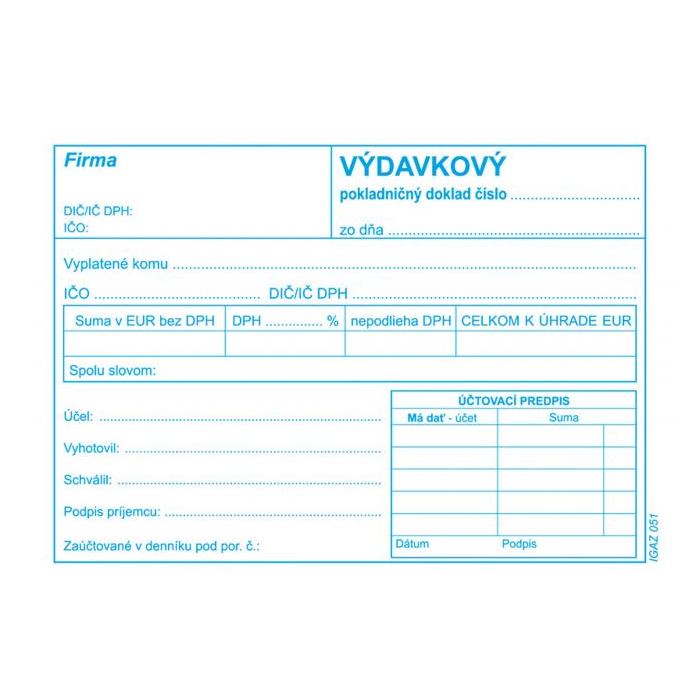 Výdavkový pokladničný doklad s DPH, samoprepis, formát A6, blok 100 listov.
