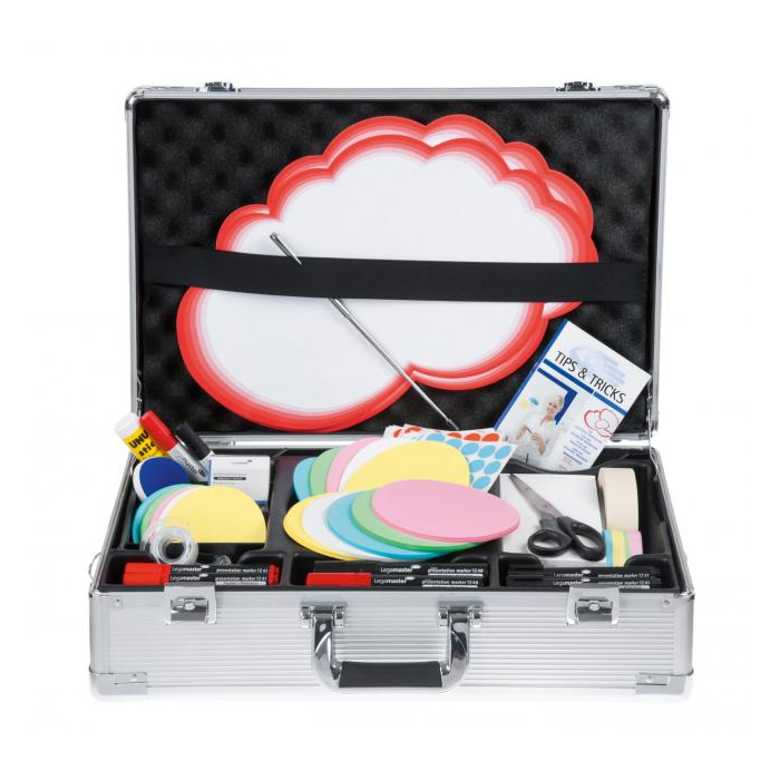 Kufor s viac ako 2 400 workshop doplnkami vrátane teleskopického ukazovátka, popisovačov, nožničiek a emočných kartičiek. Moderné hliníkové prevedenie s popruhom a madlom pre kompletnú pracovnú konferenciu alebo stretnutie. Kufor je uzamykateľný a dodávaný s 2 kľúčami. Rozmery 54 × 35 × 16 cm. Hmotnosť pri plnej výbave 6,5 kg,bez výbavy 3 kg.