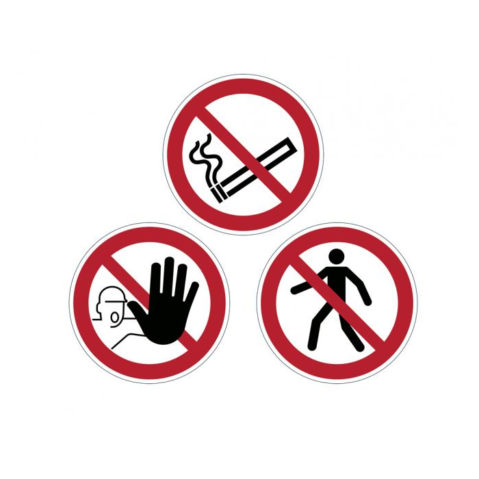 Registrované bezpečnostné označovanie na identifi káciu nebezpečných oblastí, skladovacích priestorov, chodníkov a pod. Odolnosť proti skĺznutiu R9 podľa DIN 51130 v súlade s ISO 7010. Samolepiace značky na bezpečnostné označenie pre vnútorné použitie v skladoch, distribučných centrách, výrobných závodov a i. Odolné voči oderu a ťažkej záťaži. Zákazová značka priemer 430 mm, hrúbka 0,4 mm.