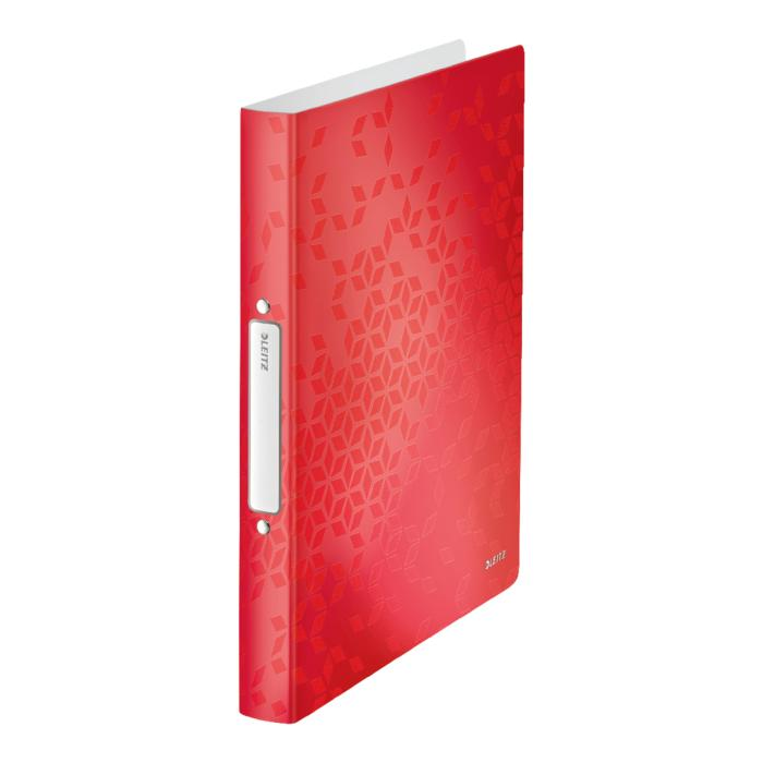 2-krúžkový zakladač v žiarivých farbách WOW s dvojfarebným efektom na prezentácie či archiváciu dokumentov. Vyrobený z dvojvrstvového polypropylénu (PP). Vhodný pre zakladanie perforovaných dokumentov alebo vložených v závesných obaloch. Samolepiaci chrbtový štítok na popis obsahu. Šírka chrbta 25 mm, 2 krúžky. Kapacita: 190 listov A4 (80 g/m²). Farba červená.