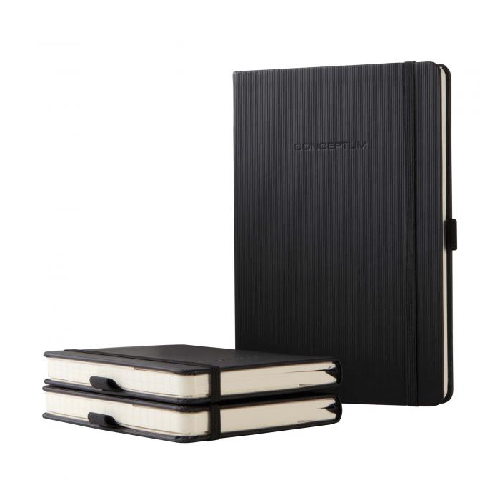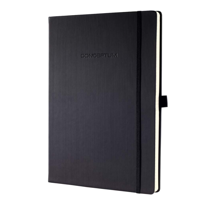 Zápisník s elastickou gumičkou, chrániacou pred nechceným otvorením. Pevná väzba s jemným ryhovaním. Čistý a jednoduchý dizajn až do posledného detailu. Moderný, elegantný, so zameraním na to podstatné. To je CONCEPTUM®, víťaz medzinárodnej ceny za dizajn. Nóbl sofi stikované zápisníky jedinečného štýlu, ktorý môžete vidieť aj cítiť, sú vhodné pre profesionálnu, ako aj pre osobnú potrebu. S citlivosťou volené materiály a vynikajúca kvalita sú skombinované so skutočnou eleganciou. Zápisníky sú vybavené osobným adresárom, uškom na pero, 2 lacetkami, vreckom na uchovanie materiálov s miestom na vizitku, k dispozícii je 20 perforovaných strán pre potreby vytrhnutia poznámok, strany v zápisníku sú číslované.Formát A4, úprava linajková. Počet strán 194. Farba čierna.