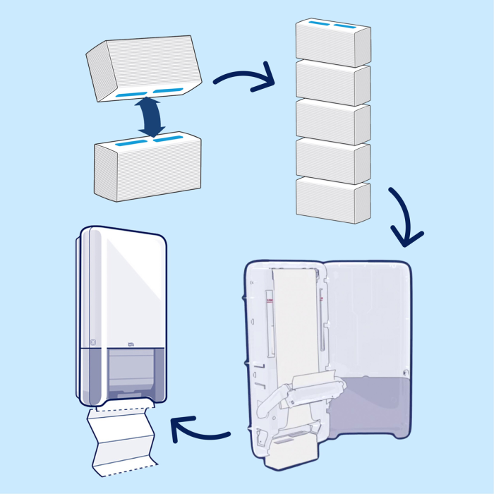 Stlačené balenie znamená o 250 % viac utierok na ruky, čím predídete nečakanému minutiu - v porovnaní s náplňami Tork Universal a Tork Xpress® zásobníkmi na papierové utierky Multifold